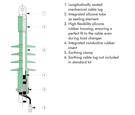 The conductor is connected with mechanical cable lugs. Available with additional splitting accessories for three-core cables.