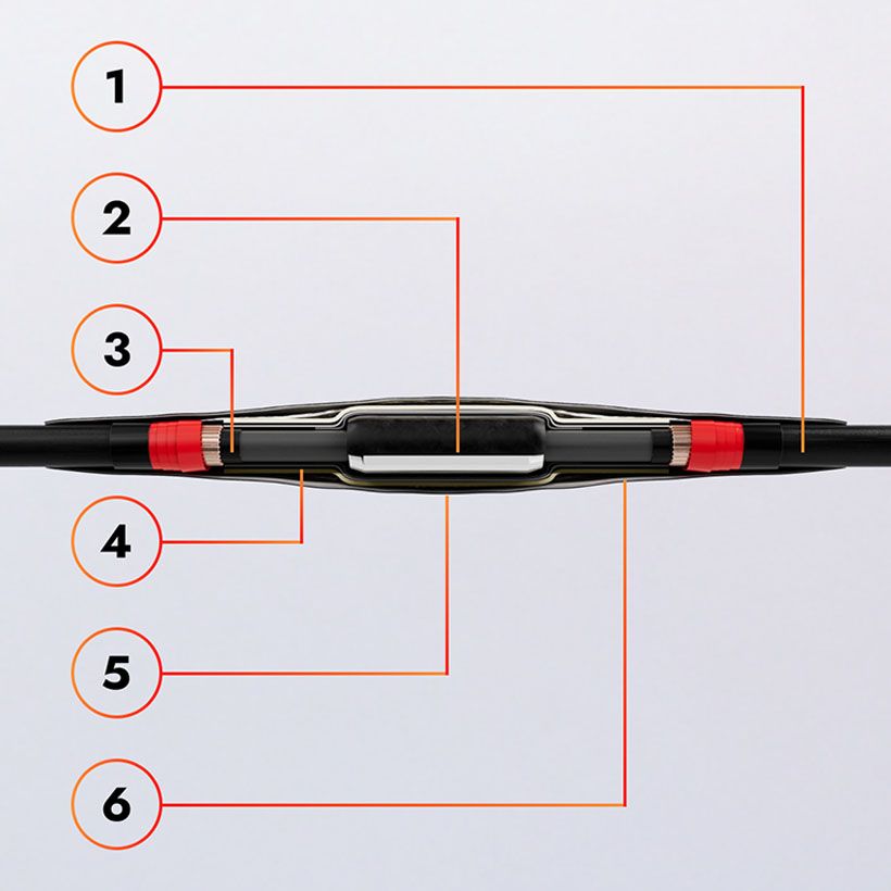 4) Chaussette cuivre : Assure un contact optimal pour la continuité de l’écran du câble grâce à la pression permanente de la protection extérieure qui s’adapte parfaitement aux expansions du câble.