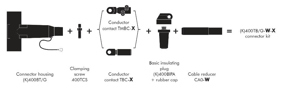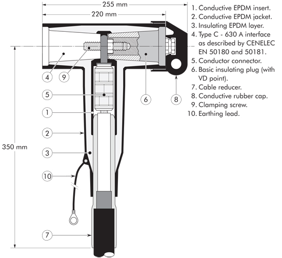 Separable tee shape connector (bolted type) designed to connect polymeric insulated cable to equipment (transformers, switchgear, motors, ...). Also connects cable to cable when using the appropriate mating parts.