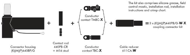 Separable coupling connector (bolted type) for dual cable arrangement. It has been designed to be used with 440TB separable Tee connector.